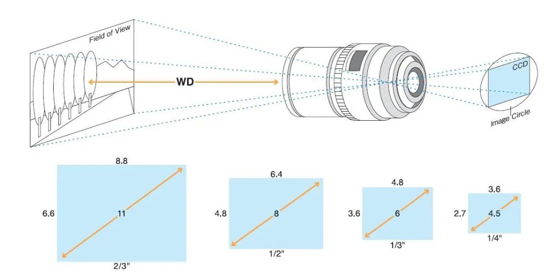 The way sensor (CCD/CMOS) sizes are represented is very confusing, because sizes like 1/1.8 inch and 2/3 inch are neither the size of any side nor the diagonal size. Looking at such sizes, it is often difficult to form a specific concept of size.