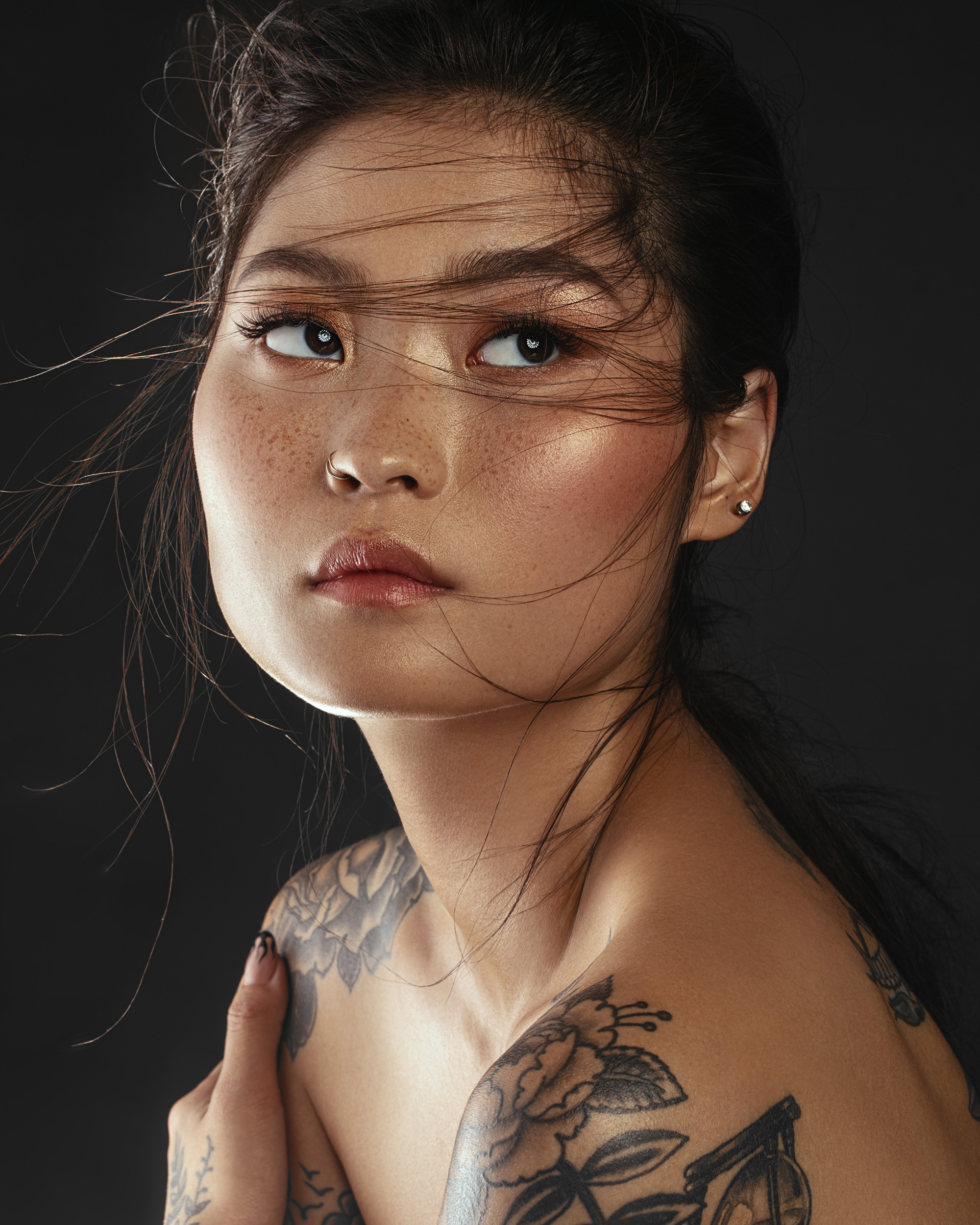 The second technique of using backlighting in the studio is by far the more common of lighting techniques and involves adding a rim light to your subject to highlight their cheekbones and bring them off of the background through lighting separation. Much like the low-key technique mentioned above, I generally add my rim light last, after all my other lights are set, as then I can adjust it independently from an already correctly exposed image. Below are a few breakdowns of lighting where a rim light or hair light is used to help add dimension to the images in the studio.