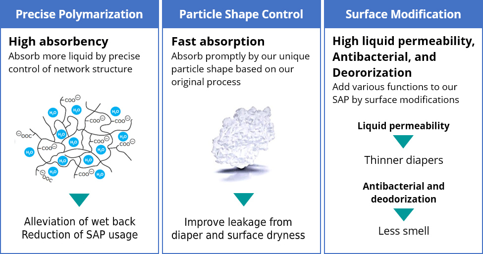 Superabsorbent Polymer (SAP) is a material capable of absorbing several hundred to 1,000 times its own weight in water. Even when subject to pressure, this polymer securely retains the absorbed liquids. In 1978, we were the first in the world to begin commercial production of SAP. Today, SAP is used in a wide range of applications, from hygiene materials used mainly in disposable diapers and sanitary products to non-hygienic applications such as agriculture & horticulture, pet, construction and civil engineering, etc.